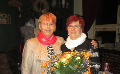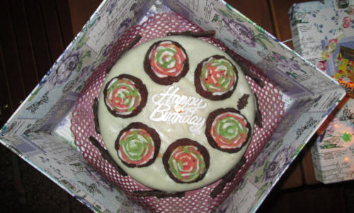 Geburtstagstorte bekommen, von Petra, rechts im Bild, und Blumen und Whiskey!)